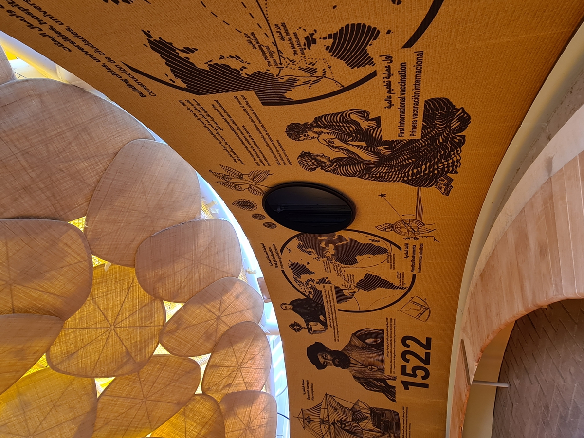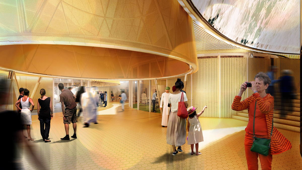 Estratégico emplazamiento en el área de Sostenibilidad, entre los pabellones de Alemania y Nueva Zelanda –dos países muy potentes en estos eventos–, y muy cerca del corazón de la Exposición Universal, la plaza Al Wasl.