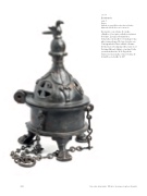 Incensario con cadena de cuerpo cilíndrico y tres pies acabados en garras de felino. La tapa es hemisférica rematada con una flor coronada por una piña y una paloma. De tres círculos con el anagrama de Cristo saldría el humo del incienso. Su origen podría estar en el Próximo Oriente, Egipto o incluso Italia, y resulta indicativo de la llegada de foráneos relacionada con la reforma de la basílica en el siglo VI d. C.