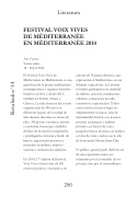 Setè, FranciaVarias sedes18 - 26 Jul 2014El Festival Voix Vives de Méditerranée en Méditerranée es una gran fiesta de la poesía mediterránea contemporánea y organiza festivales literarios en Sète y, desde 2013, también en Toledo, Túnez y Génova. La sede francesa del evento organiza más de 450 actos en diferentes lugares de la ciudad de Sète durante diez días en el mes de julio. Allí poetas y músicos, actoresy cuentistas, hacen que el público disfrute de momentos inesperadosy privilegiados: lecturas a bordo de barcos, espectáculos poéticos y musicales en jardines, improvi- saciones y animaciones callejeras.En 2014, 17a edición del festival, Voix Vives ofreció más de 650 eventos poéticos y musicales conautores de 38 países distintos, que representan al Mediterráneo en sus distintas expresiones. Los artistas invitados participaron en multitud de talleres, acciones, instalaciones artísticas, actuaciones de calle, conciertos y espectáculos. Todos estos eventos tuvieron lugar en emplazamientos únicos, seña de identidad del festival, con lecturas poéticas en parques y jardines privados, en barcos de vela y pequeñas barcas de pesca, en la playa a la luz de velas e incluso en lo alto de la montaña Mount Saint Clair.El público general pudo disfrutar así de una experiencia única, no solamente por el contenido de los poemas, sino por el extraordinarioLiteraturaFESTIVAL VOIX VIVES DE MÉDITERRANÉEEN MÉDITERRANÉE 2014280Resultados ‘14